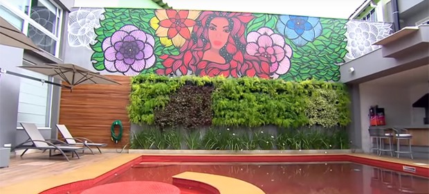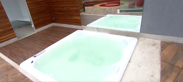 No gramado da residência, há também uma mesa de futmesa personalizada, estampada com uma foto sua de biquíni.