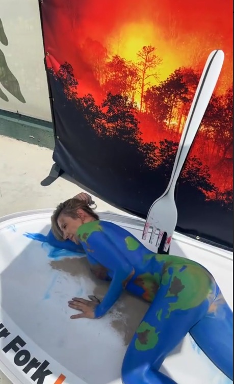 No local, ela deitou em um "prato" gigante e fingiu estar sendo espetada por um garfo. Ao fundo, é possível ver uma imagem de uma floresta pegando fogo. "Por favor, seja vegano", dizia o cartaz atrás dela. Luisa contou com o apoio da PETA (Pessoas pelo Tratamento Ético dos Animais), uma organização de direitos dos animais.