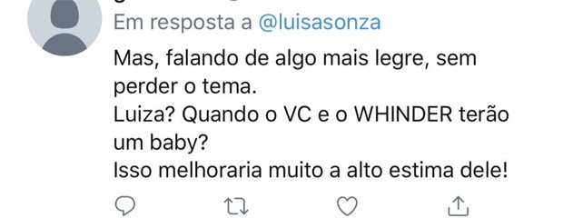 Luisa Sonza foi cobrada por alguns fãs para engravidar com o intuito de melhor "melhorar a autoestima" de Whindersson Nunes. Com informações da Quem.