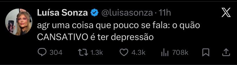 A cantora Luísa Sonza voltou a abordar publicamente sua saúde mental nesta terça-feira (10), ao compartilhar reflexões sobre o impacto da depressão e da ansiedade em sua rotina. Diagnosticada com os transtornos, ela destacou o desgaste diário provocado pelas condições e chamou atenção para um aspecto que considera pouco debatido.