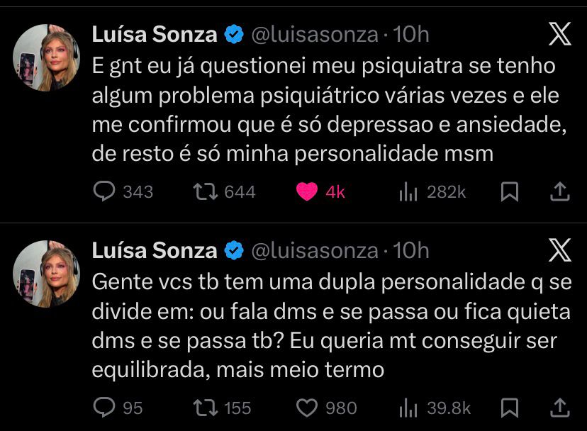 Em outras publicações, ela explicou que já buscou acompanhamento médico para compreender melhor seu quadro emocional.