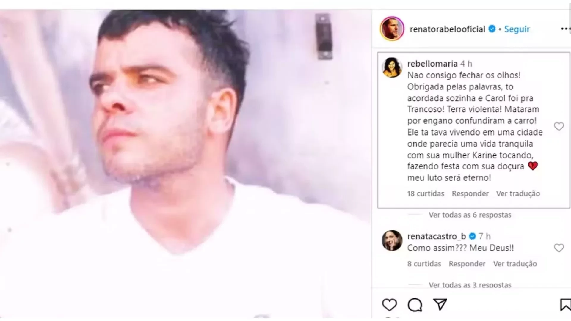 Em um post emocionante nas redes sociais, Maria acredita que o filho foi morto por engano. "Terra violenta! Mataram por engano, confundiram o carro! Ele tava vivendo em uma cidade onde parecia uma vida tranquila com sua mulher Karine, tocando, fazendo festa com sua doçura, meu luto será eterno", escreveu.