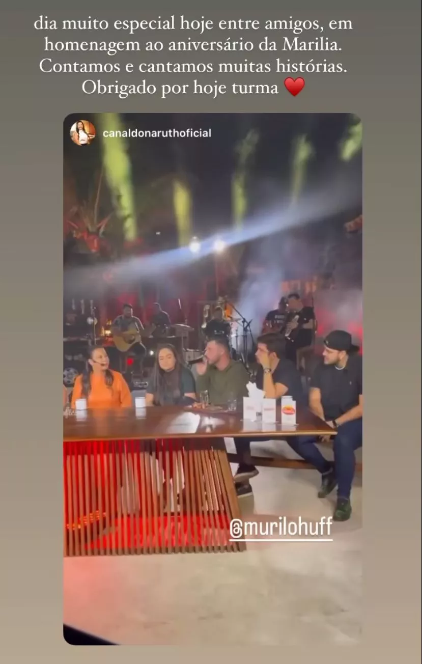 "Gravação especial acontecendo agora para nossa Marilinha. Hoje o dia está sendo de de homenagem, um dia especial", disse dona Ruth em publicações do perfil de seu canal. "Dia muito especial entre amigos, em homenagem ao aniversário da Marília. Contamos e cantamos muitas histórias. Obrigado por hoje, turma", escreveu Murilo no Instagram. Informações: Quem