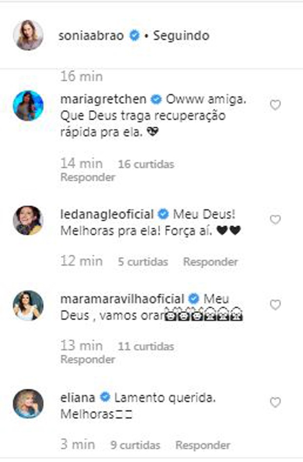 Logo que publicou a foto da mãe, Sonia passoun a receber uma série de comentários de apoio de fãs e de famosos. "Que Deus traga recuperação rápida pra ela.", disse Gretchen. Eliana foi uma famosa que também se solidarizou: "Lamento, querida. Melhoras!".