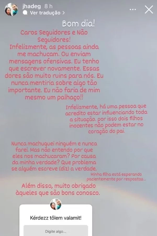 Ainda em seu desabafo, a modelo de 32 anos revelou que há uma pessoa próxima ao jogador que estaria dificultando o processo de reconhecimento da paternidade de Jázmin e a convivência com a filha mais nova, Helena, fruto da relação com Amanda Kimberlly.