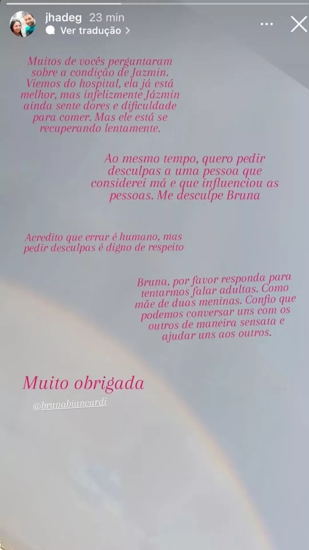 "Muitos de vocês perguntaram sobre a condição de Jazmin. Viemos do hospital, ela já está melhor, mas infelizmente ainda sente dores e dificuldade para comer. Mas ele está se recuperando lentamente", introduziu a explicação.