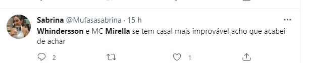 Na web, muitos ficaram surpresos com as notícias e não se conformaram com o suposto novo casal. "Whindersson e Mirella pra mim é muito vibes Selena e Faustão: aleatório, perfeito pras fic da minha cabeça", brincou um. "Gente, que história é essa de Mirella e Whindersson? Esse quebra-cabeça está confuso e quem começou vai ter que desvendar", pediu outo. "Whindersson e MC Mirella, se tem casal mais improvável, acho que acabei de achar", comentou outro.