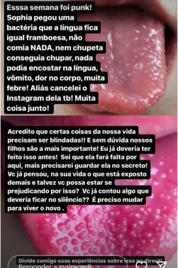 Através de seus stories no Instagram, a empresária contou que a menina não estava conseguindo se alimentar direito e que estava, inclusive, sem conseguir usar sua chupeta. “Essa semana foi punk! Sophia pegou uma bactéria que deixou a língua igual a uma framboesa; não comia nada, nem chupeta conseguia chupar. Nada podia encostar na língua, vômito, dor no corpo, muita febre! Aliás, cancelei o Instagram dela também. Muita coisa junto”, iniciou a influenciadora em seu desabafo.