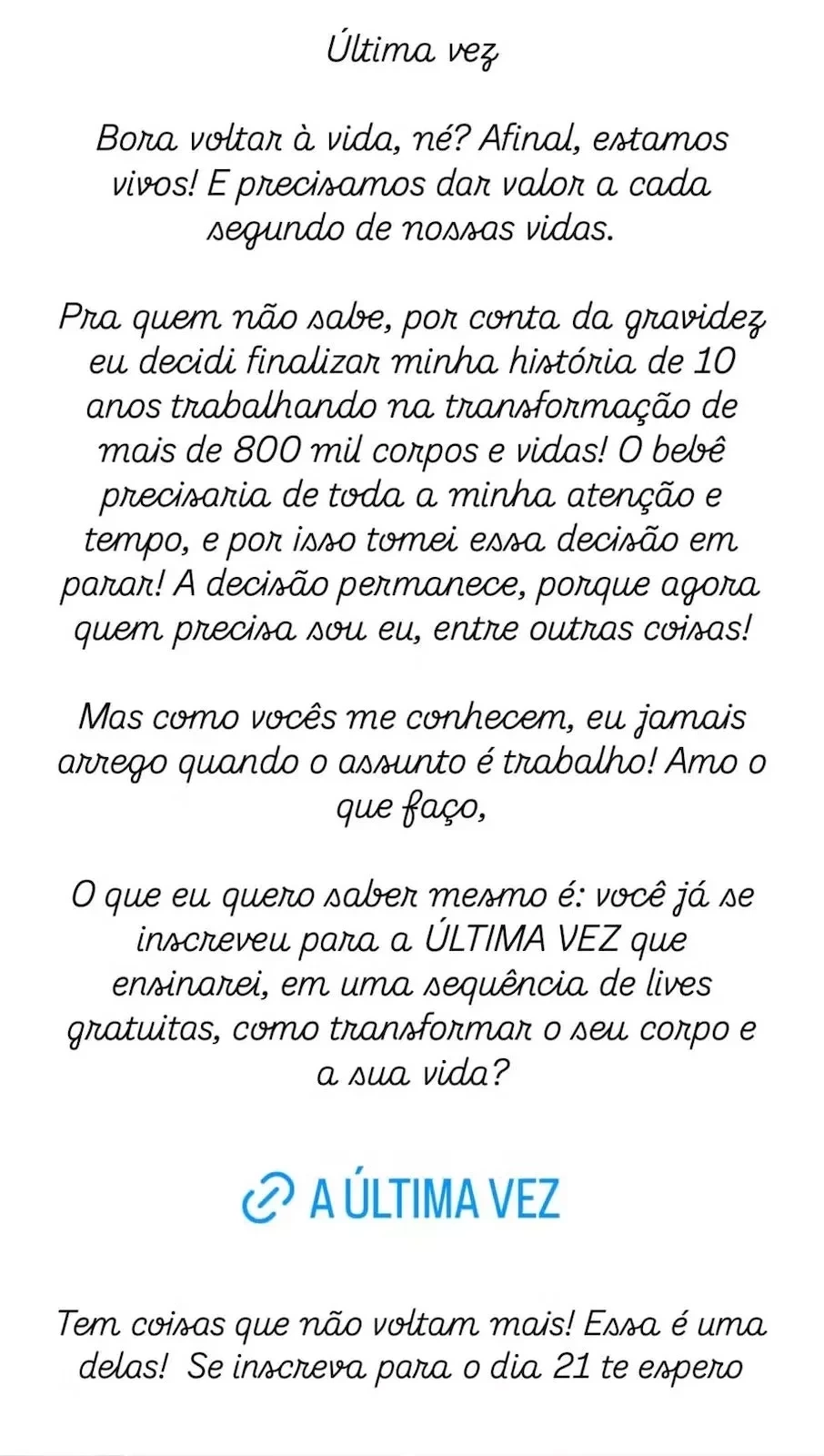 “Por conta da gravidez, eu decidi finalizar minha história de dez anos trabalhando na transformação de mais de 800 mil corpos e vidas! O bebê precisaria de toda a minha atenção e tempo, e por isso tomei essa decisão de parar! A decisão permanece porque agora quem precisa sou eu, entre outras coisas!”, escreveu Maíra em uma publicação.