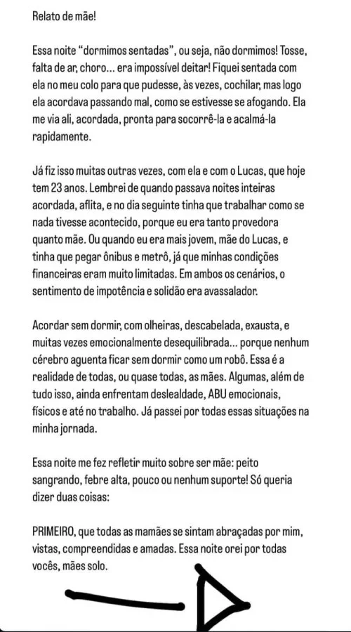 Pouco tempo depois, a coach publicou um longo texto em seus stories, relembrando sua trajetória como mãe de dois filhos. “Lembrei de quando passava noites inteiras acordada, aflita, e no dia seguinte tinha que trabalhar como se nada tivesse acontecido, porque eu era tanto provedora quanto mãe. Ou quando eu era mais jovem, mãe do Lucas, e tinha que pegar ônibus e metrô, já que minhas condições financeiras eram muito limitadas”, disse ela.