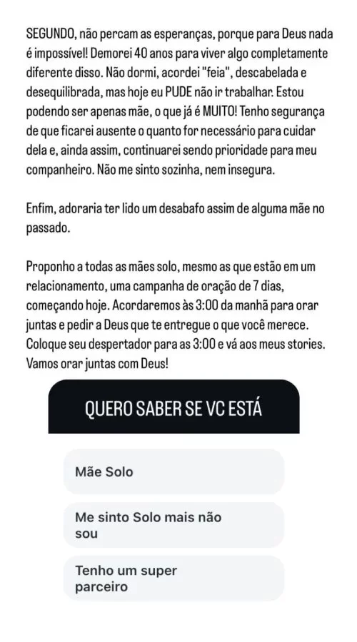 “Proponho a todas as mães solo, mesmo as que estão em um relacionamento, uma campanha de oração de 7 dias, começando hoje. Acordaremos às 3:00 da manhã para orar juntas e pedir a Deus que nos entregue o que merecemos. Coloque o despertador para as 3:00 e vá aos meus stories. Vamos orar juntas com Deus!”, finalizou.