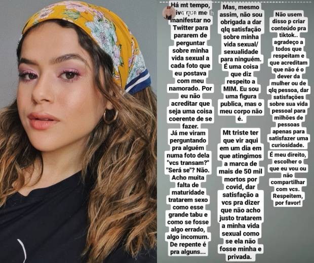 "Há muito tempo tive que me manisdestar no Twitter para pararem de perguntas sibre minha vida sexual a cada foto que eu postava com meu namorado. Por não acreditar que seja uma coisa coerente de se fazer. [...] Acho muita falta de maturidade tratarem sexo como esse grande tabu e como se fosse algo errado, algo incomum. De repente, é para alguns.. Mas, mesmo assim, não sou obrigada a dar quaquer satisfação sibre minha vida sexuak/sexualidade para ninguém. É uma coisa que diz respeito a mim. Eu sou uma figura pública, mas o meu corpo não é", declarou ela.