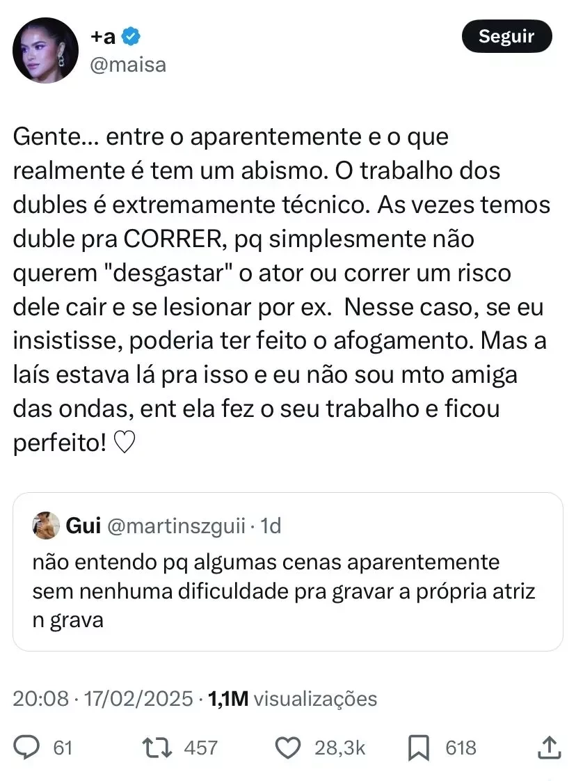Em resposta, Maisa destacou que o uso de dublês envolve questões técnicas e de segurança.