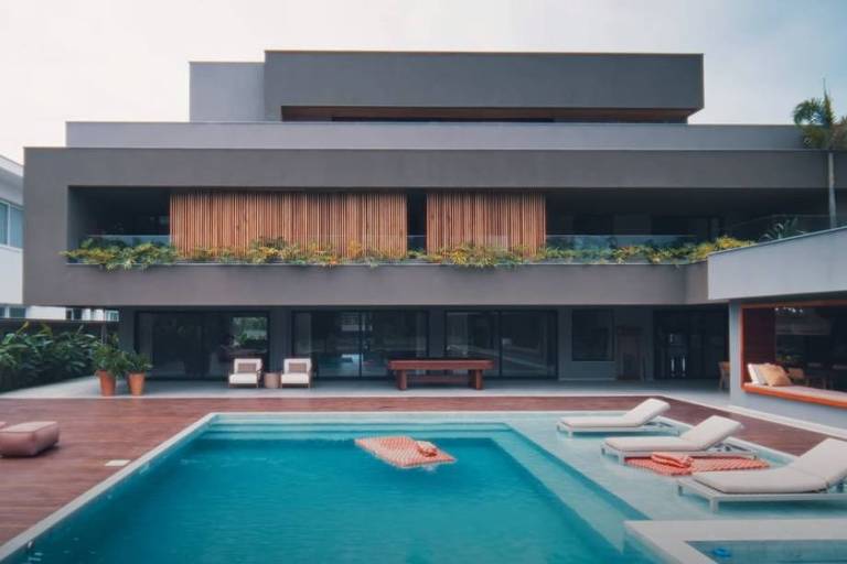 Quarto do casal possui paleta de cores claras e texturas naturais. Paolla mantém um espaço reservado na varanda de seu quarto para um altar ecumênico. Área externa tem piscina e espaço gourmet.