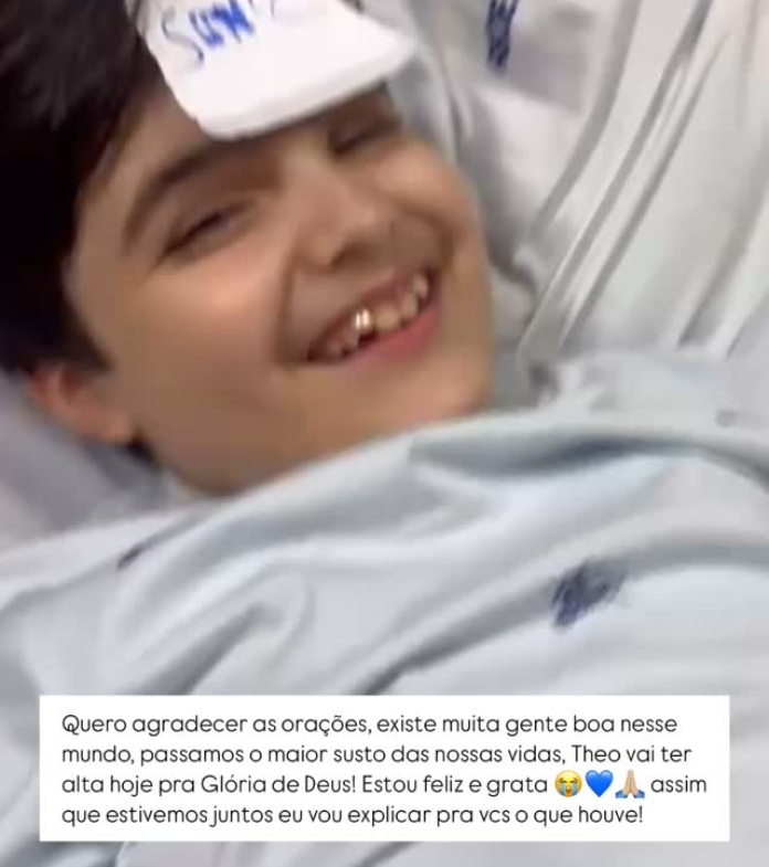 Já nesta sexta-feira (11), Manu compartilhou que Theo recebeu alta médica. “Quero agradecer as orações. Existe muita gente boa nesse mundo, passamos o maior susto das nossas vidas. Theo vai ter alta hoje, para a glória de Deus! Estou feliz e grata. Assim que estivermos juntos eu vou explicar para vocês o que houve”, contou.