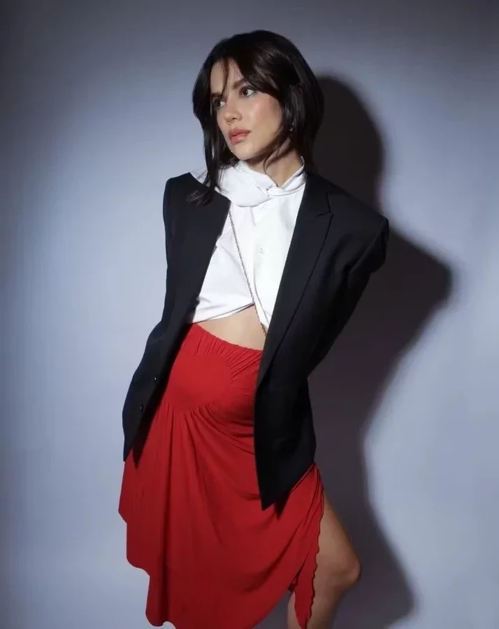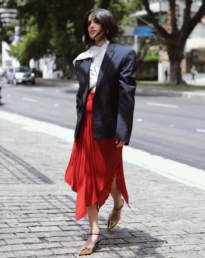 A mamãe de primeira viagem segue estilosa. Nos registros compartilhados, ela aparece usando uma saia midi vermelha com pregas, fendas laterais e um detalhe em formato de coração. Ela aproveitou para combinar a peça com um cropped branco e um blazer azul-marinho. A barriga ficou marcando, e ela deixou até mesmo um pouco de pele à mostra.