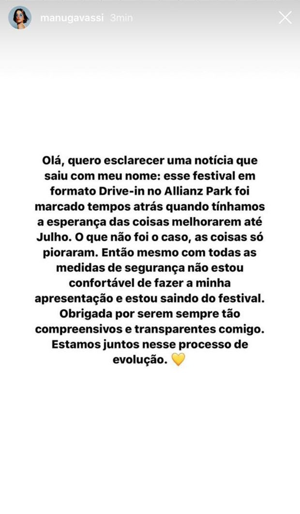 "Olá, quero esclarecer uma notícia que saiu com meu nome: esse festival em formato Drive-in no Allianz Park foi marcado tempos atrás quando tínhamos a esperança das coisas melhorarem até Julho. O que não foi o caso, as coisas só pioraram. Então mesmo com todas as medidas de segurança não estou confortável de fazer a minha apresentação e estou saindo do festival. Obrigada por serem sempre tão compreensivos e transparentes comigo. Estamos juntos nesse processo de evolução", escreveu a cantora em suas redes sociais.