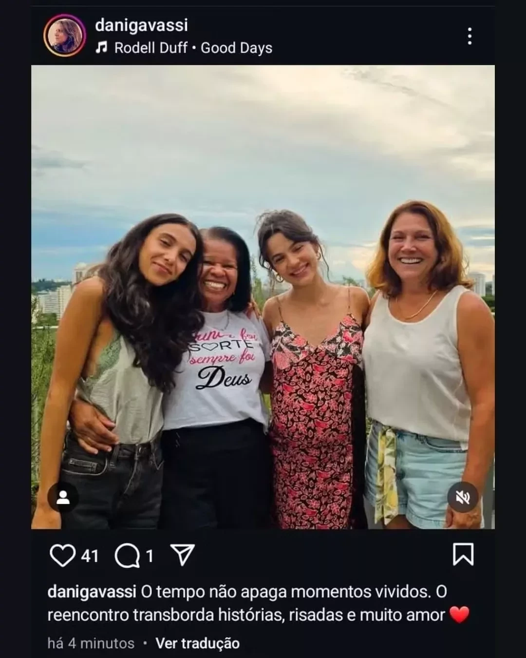 Manu Gavassi, com 32 anos, completou sete meses de gestação e foi registrada ao lado da mãe, Dani Gavassi, e de duas amigas. "O tempo não apaga momentos vividos. O reencontro transborda histórias, risadas e muito amor", escreveu Dani na legenda da imagem divulgada no Instagram.