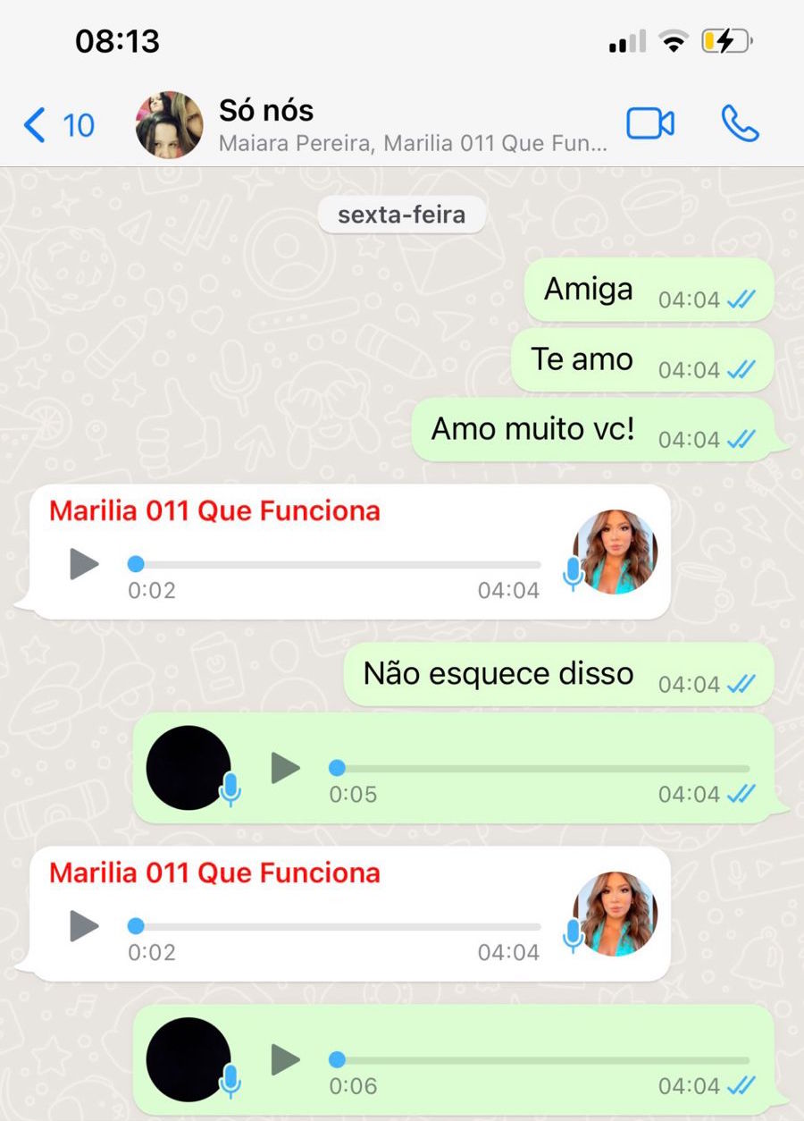 Maraisa, da dupla com Maiara, mostrou em seu Twitter nesta segunda-feira (8) um print da última conversa que teve com Marília Mendonça, horas antes do acidente aéreo que matou a cantora em Piedade de Caratinga (MG) na última sexta-feira (5). No registro, é possível ver as duas trocando declarações de carinho.
