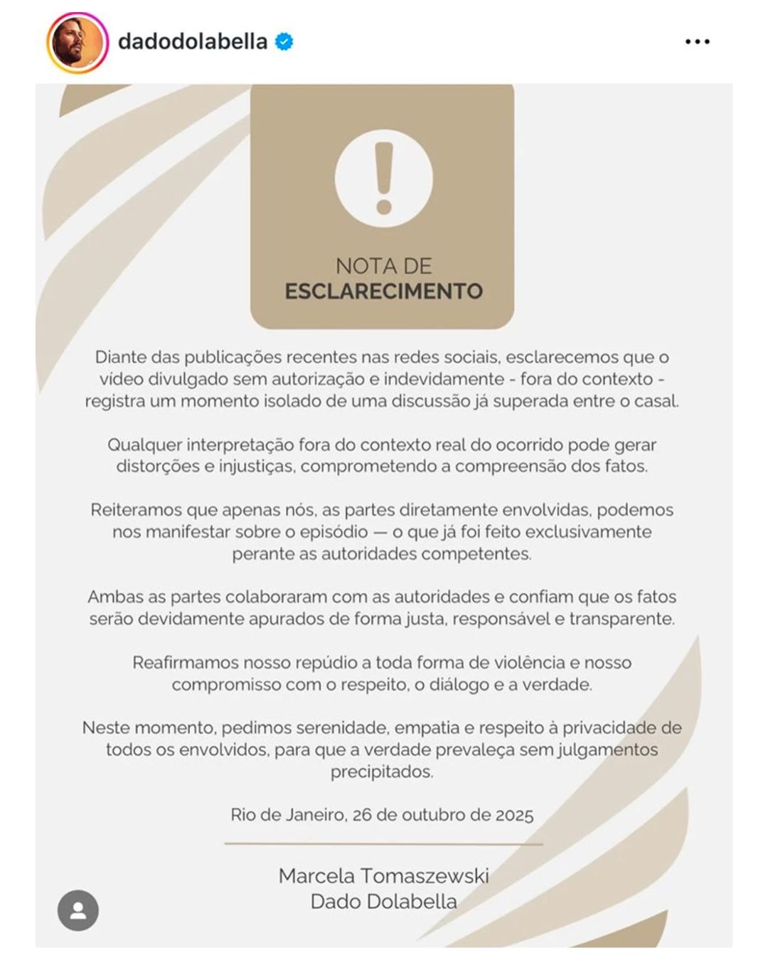 A publicação também afirmava que ambos já haviam prestado esclarecimentos às autoridades. “Qualquer interpretação fora do contexto real do ocorrido pode gerar distorções e injustiças, comprometendo a compreensão dos fatos. Reiteramos que apenas nós, as partes diretamente envolvidas, podemos nos manifestar sobre o episódio — o que já foi feito exclusivamente perante as autoridades competentes”, dizia o texto.