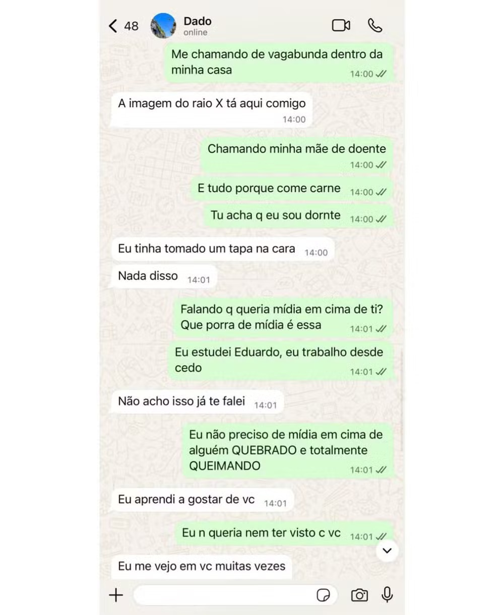 A modelo publicou conversas com amigas e diálogos que atribui a Dado. Em um grupo, ela relatou episódios de gritos e medo: