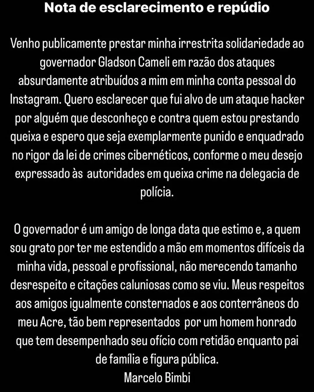 Pronunciamento de Marcelo Bimbim após acusar governador de estupro"O governador é um amigo de longa data que estimo e, a quem sou grato por ter me estendido a mão em momentos difíceis da minha vida, pessoal e profissional, não merecendo tamanho desrespeito e citações caluniosas como se viu. Meu respeito aos amigos igualmente consternados e aos conterrâneos do meu Acre, tão bem representado por um homem honrado, que tem desempenhado seu ofício com retidão enquanto pai de família e figura pública", finalizou.