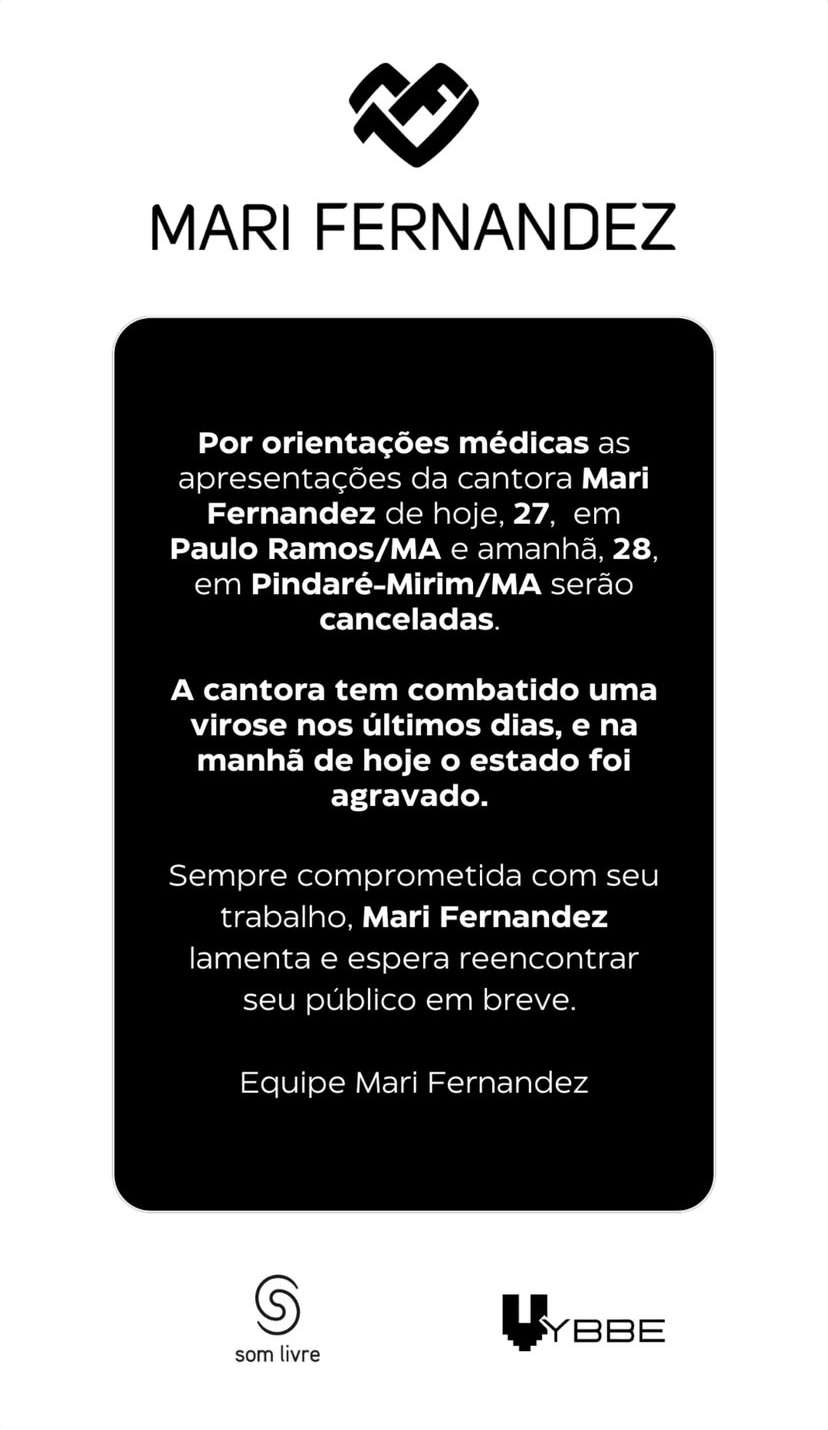 “Por orientações médicas, as apresentações da cantora Mari Fernandez de hoje, 27, em Paulo Ramos/MA, e amanhã, 28, em Pindará-Mirim/MA, serão canceladas. A cantora tem combatido uma virose nos últimos dias, e na manhã de hoje o estado foi agravado”, informou a nota.
