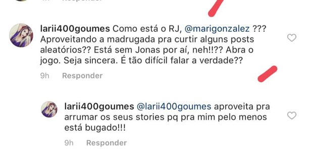 "Eu exponho a minha vida aqui, na hora de uma situação difícil eu também tenho que expor. Muita gente que me segue aqui gosta de mim e de Jonas. Eu quero deixar registrado, não sei quanto de perigo está tendo, não sei o nível psicológico dessa pessoa. Já estou procurando ajuda, mas queria compartilhar com vocês. Isso já está acontecendo há um tempo, meus amigos já sabiam", contou Mariana.