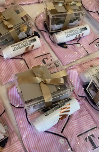 As madrinhas também receberam, na sacola luxuosa de presentes, pijamas personalizados com as iniciais de seus nomes, mules em couro e cosméticos.