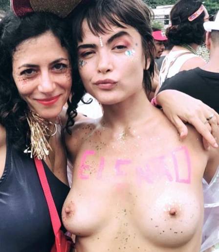 Maria Casadevall faz protesto de topless em bloco de carnaval |