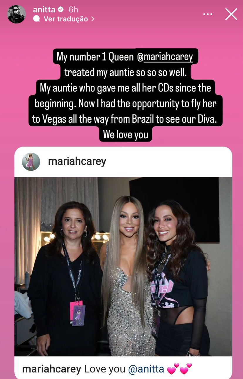''Nunca em meus maiores sonhos imaginaria poder estar no seu show, menos ainda sendo recebida pela sua equipe maravilhosa, menos ainda apresentando minha tia pra ela. Mariah nos recebeu com tanto amor. Chorei durante o show pensando o quanto que minha vida é abençoada, quantos sonhos minha carreira me ajudou a realizar. Pensava: e se eu tivesse desistido naquela dificuldade? Não estaria aqui hoje, nem no show, nem no camarim e nem nas várias outras oportunidades lindas que a vida tem me dado. Minha tia voou do Brasil pra Vegas só pra ver nossa Diva 2 noites seguidas, e eu pude proporcionar esse momento de gratidão a ela, valeu cada minuto. Que felicidade'', finalizou.