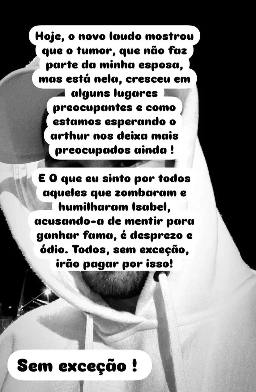 “Hoje, o novo laudo mostrou que o tumor, que não faz parte da minha esposa, mas está nela, cresceu em alguns lugares preocupantes e como estamos esperando o Arthur nos deixa mais preocupados ainda ! E O que eu sinto por todos aqueles que zombaram e humilharam Isabel, acusando-a de mentir para ganhar fama, é desprezo e ódio. Todos, sem exceção, irão pagar por isso”, desabafou.