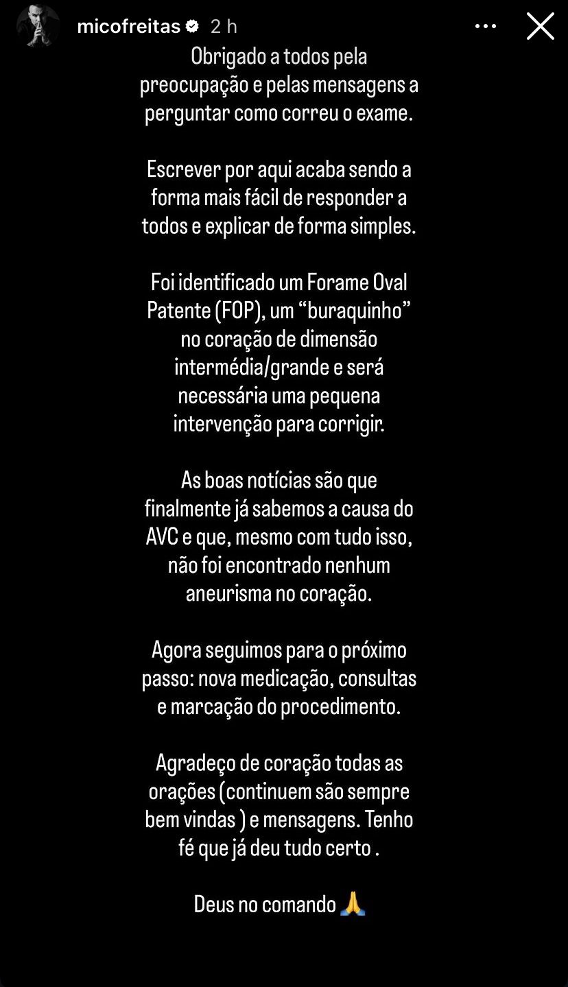 Mico Freitas usou as redes sociais nesta quinta-feira (16) para tranquilizar os seguidores e detalhar o resultado do exame que identificou a causa do AVC isquêmico que sofreu no último dia 6, em Lisboa. "Obrigado a todos pela preocupação e pelas mensagens a perguntar como correu o exame. Escrever por aqui acaba sendo a forma mais fácil de responder a todos e explicar de forma simples", disse o empresário.