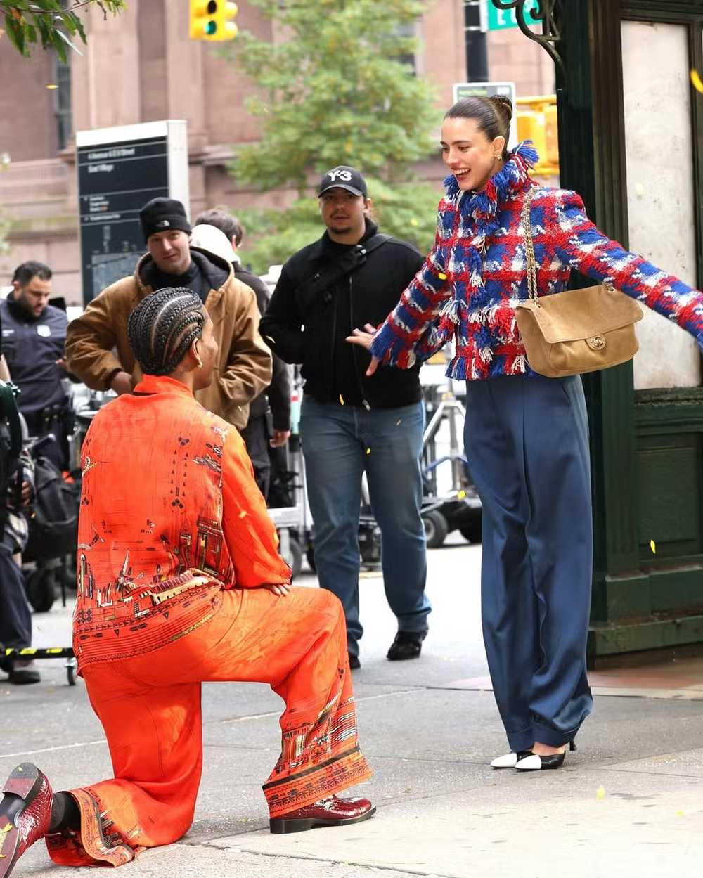 O rapper A$AP Rocky foi visto ajoelhado pedindo Margaret Qualley em casamento. A cena foi gravada na última terça-feira (28), próximo à estação de metrô Astor Place, em Nova York.