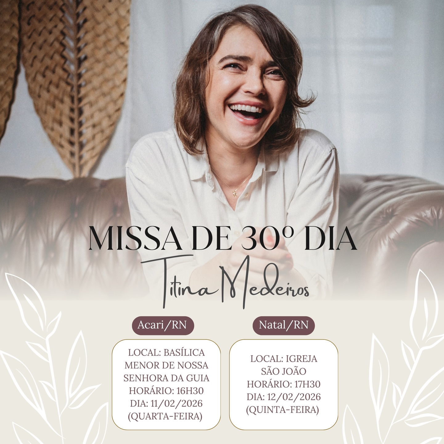 Além da homenagem, uma página ligada à família divulgou informações sobre missas em intenção da alma de Titina Medeiros. A primeira celebração acontece às 16h30, na Basílica Menor de Nossa Senhora da Guia, em Acari, no Rio Grande do Norte. A segunda está marcada para quinta-feira, às 17h30, na Igreja São João, em Natal.