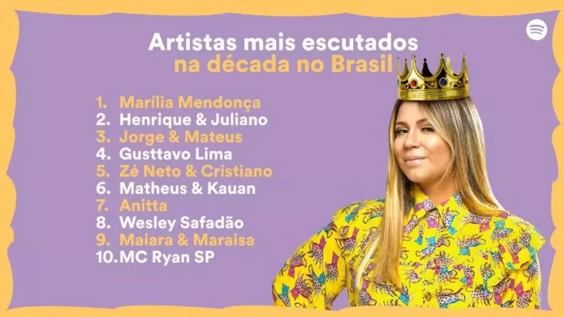 Ao longo dos últimos 10 anos, vários artistas brasileiros dominaram as paradas, mas o sertanejo manteve sua supremacia. Marília Mendonça, que faleceu em 2021 em um acidente aéreo, é a artista mais ouvida na plataforma nesse período. Além dela, outras seis duplas e artistas do gênero estão no top 10.