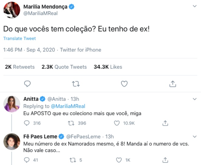 "Do que você tem coleção? Eu tenho de ex", tweetou ela, divertindo seus seguidores da rede social. Mas, calma lá, que temos outra competidora bastante difícil de enfrentar: Anitta. A Poderosa entrou na onda da amiga e logo respondeu o tweet de Marília. "Eu aposto que eu coleciono mais que você, miga", escreveu a cantora de Desce Pro Play.