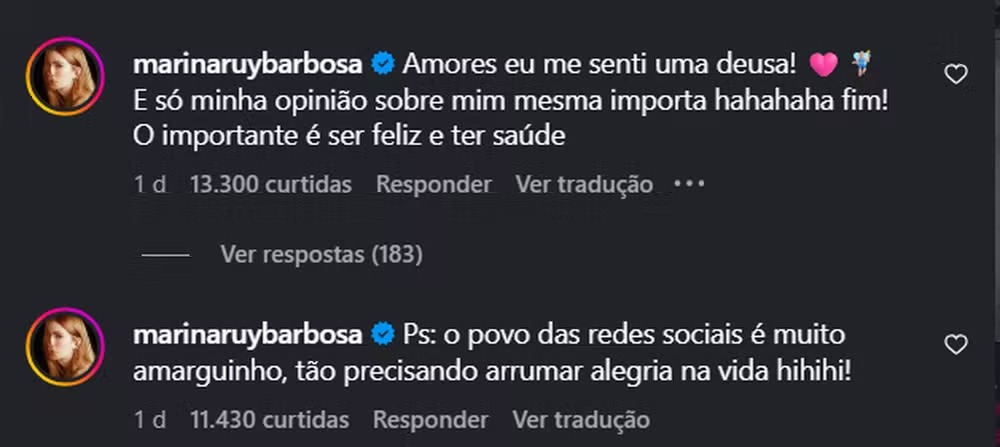 A empresária se manifestou diretamente nos comentários. "Amores, eu me senti uma deusa! E só minha opinião sobre mim mesma importa hahahaha fim! O importante é ser feliz e ter saúde", escreveu Marina.