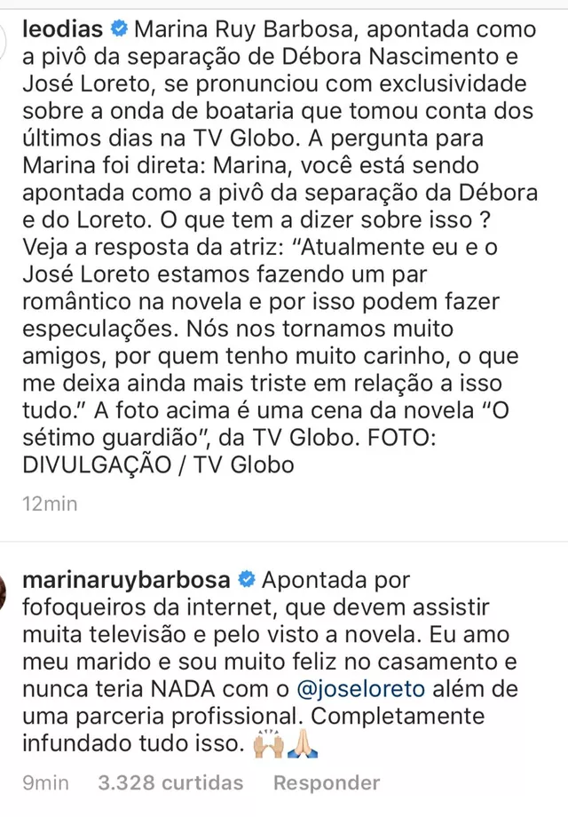 O colunista Leo Dias divulgou em seu perfil do Instagram o pronunciamento da ruiva: “Atualmente eu e o José Loreto estamos fazendo um par romântico na novela e por isso podem fazer especulações. Nós nos tornamos muito amigos, por quem tenho muito carinho, o que me deixa ainda mais triste em relação a isso tudo”.