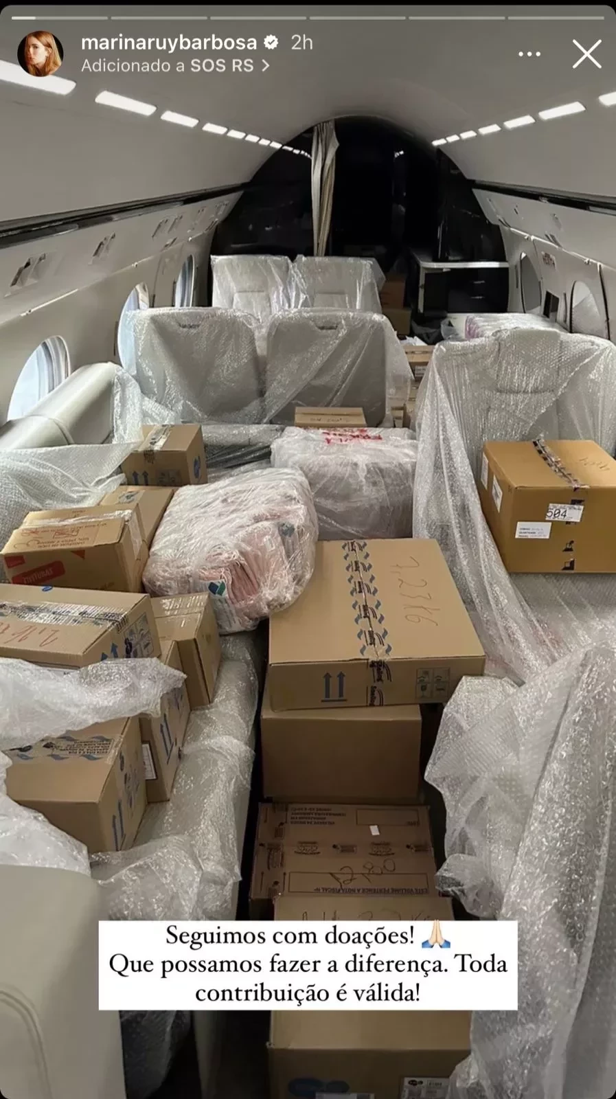 Marina Ruy Barbosa, de 28 anos, compartilhou nesta terça-feira (14) que enviou um jatinho com doações para as pessoas que estão desabrigadas no Rio Grande do Sul.