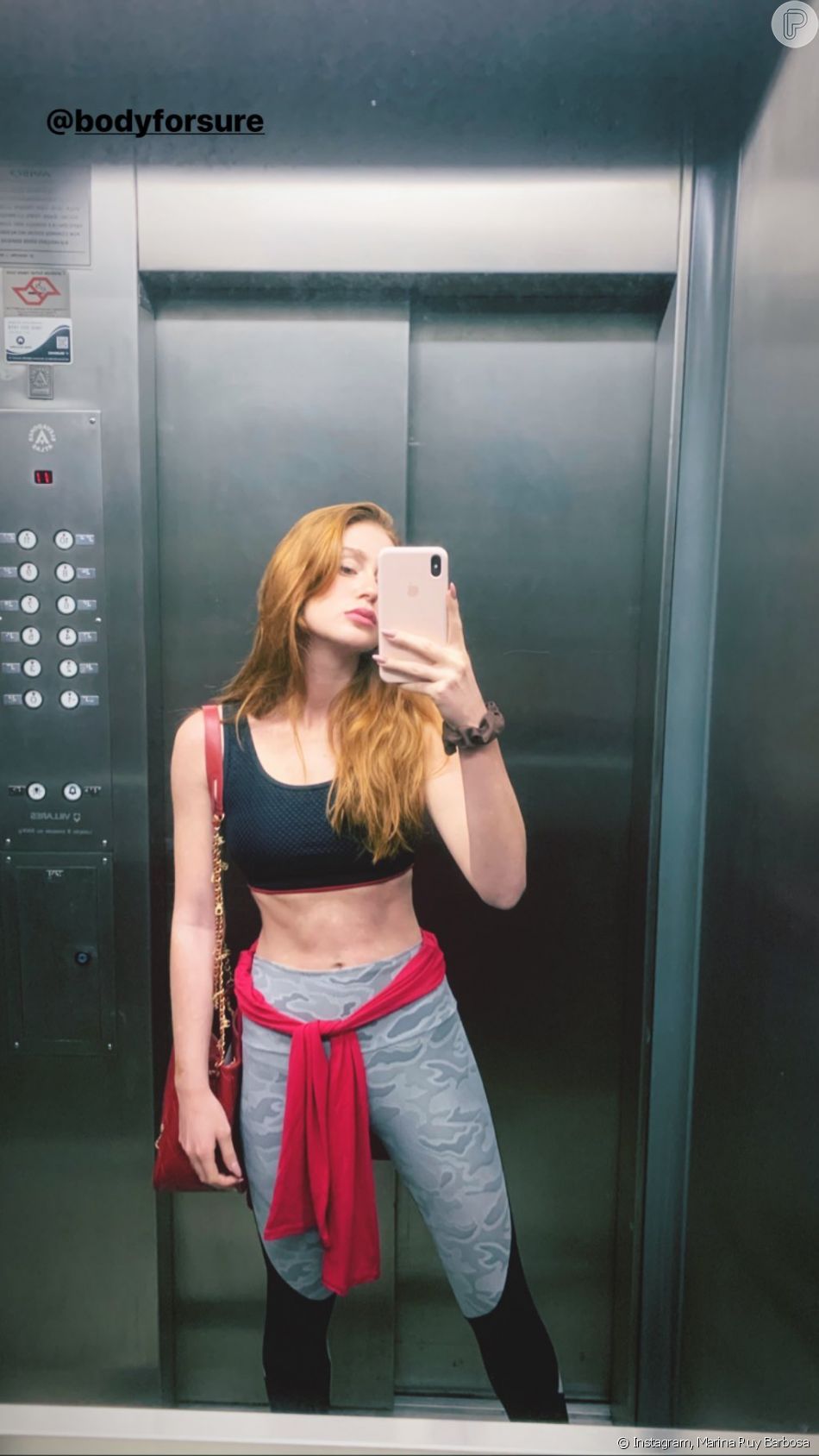 Marina Ruy Barbosa deixou a preguiça de lado e se exercitou na noite de sexta-feira (02): em seus Instagram Stories, a atriz - elogiada ao aparecer com make em tom alaranjado em selfie - compartilhou uma foto sem maquiagem em frente ao espelho com look fitness e a barriga definida, deixada de fora com a combinação de top e calça legging, chamou atenção. Ela ainda mostrou uma foto de seu encontro com seu afilhado, Eduardo, filho mais novo de Luma Costa, batizado no fim de outubro no Rio de Janeiro.