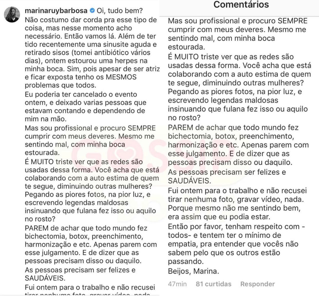 Em férias das novelas desde o fim de O Sétimo Guardião, Marina prosseguiu o desabafo contra o perfil @postadaxmarcada: "É muito triste ver que as redes são usadas dessa forma. Você acha que está colaborando com a autoestima de quem te segue, diminuindo outras mulheres? Pegando as piores fotos, a pior luz e escrevendo legendas maldosas, insinuando que fulana fez isso ou aquilo no rosto. Parem de achar que todo mundo fez bichectomia, botox, preenchimento, harmonização, etc. Apenas parem com esse julgamento. E de dizer que as pessoas precisam disso ou daquilo. As pessoas precisam ser felizes e saudáveis. Fui para o trabalho e não recusei tirar nenhuma foto, gravar vídeo, nada. Porque, mesmo não me sentido bem, era assim que eu podia estar. Então, por favor, tenham respeito com todos e tentem ter o mpínimo de empatia para entender que vocês não sabem pelo o que os outros estão passando."