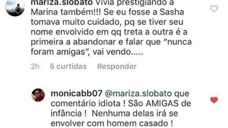 Em resposta ao comentário, Mônica escreveu: "Que comentário idiota! São amigas de infância! Nenhuma delas irá se envolver com um homem casado.