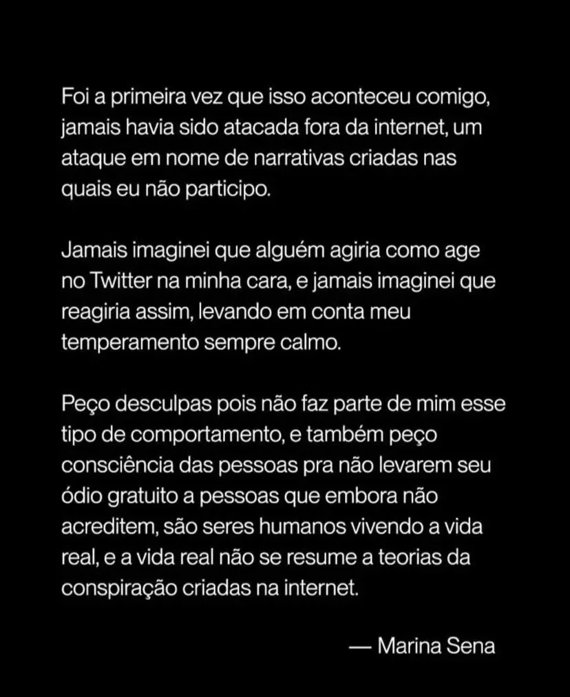 "Peço desculpas, pois não faz parte de mim esse tipo de comportamento, e também peço consciência das pessoas pra não levar seu ódio gratuito a pessoas que, embora não acreditem, são seres humanos vivendo a vida real", concluiu.