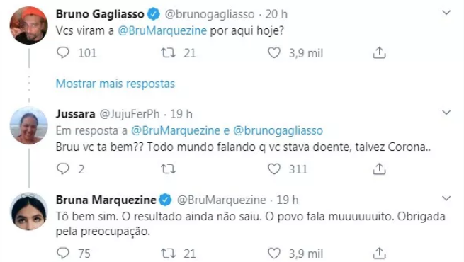 "Tô bem sim. O resultado ainda não saiu. O povo fala muuuuuuito. Obrigada pela preocupação", responde a atriz a um fã e a Bruno Gagliasso.