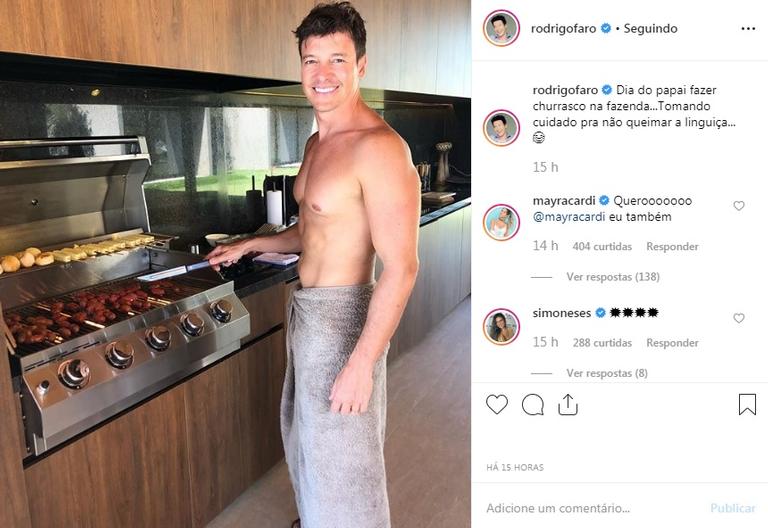 Rodrigo compartilhou com os fãs uma foto em que aparece comandando a churrasqueira bem à vontade, apenas com uma toalha enrolada na cintura. “Dia do papai fazer churrasco na fazenda...Tomando cuidado pra não queimar a linguiça...”, brincou o astro.