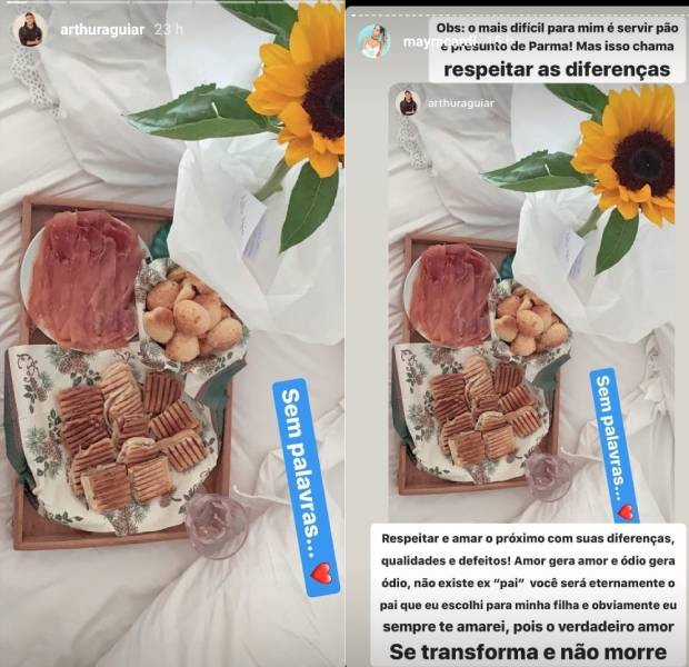 Mayra Cardi mostrou que a relação com Arthur Aguiar continua de amizade e carinho, mesmo após os dois terem se separado no início de maio, após 3 anos juntos -- eles são pais de Sophia, de 1 ano. Tanto que a ex-BBB mandou neste domingo (7) uma cesta de café da manhã e flores ao ex. As informações são da Quem.