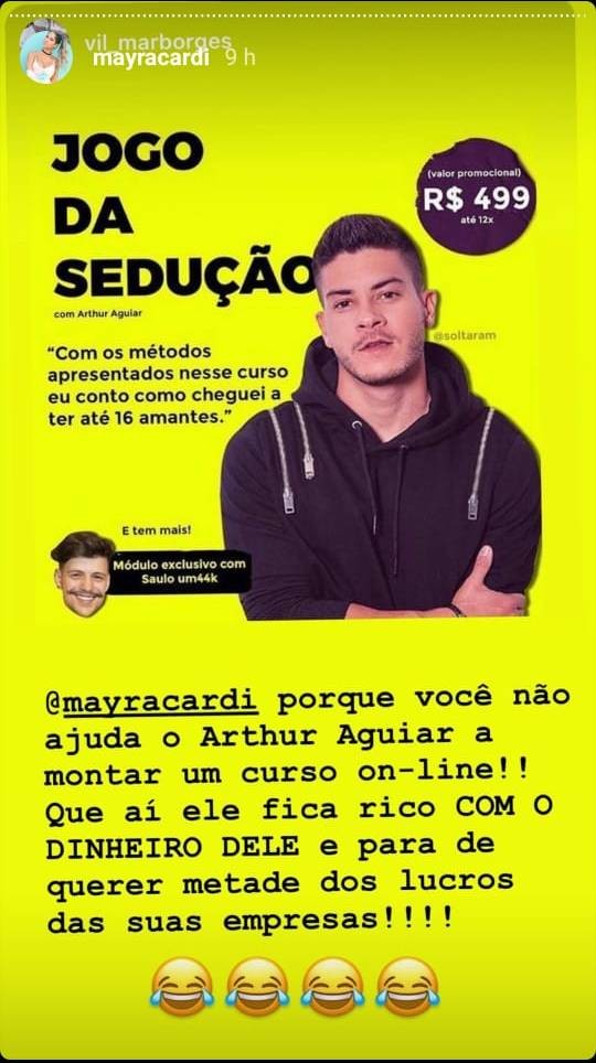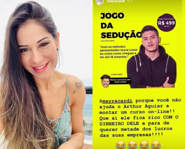 Mayra Cardi mostrou que também sabe dar risada da polêmica separação de Arthur Aguiar, com quem disse ter vivido um relacionamento abusivo e ter sido traída diversas vezes -- este último fato, assumido pelo ator. A ex-BBB, agora empresária e life coach, compartilhou em sue Instagram na noite desta terça-feira (21) uma sugestão um tanto inusitada de um seguidor, que dizia para Arthur criar um curso de sedução. As informações são da Quem.