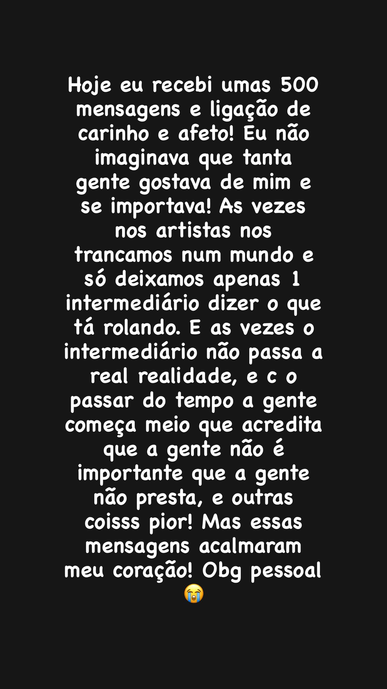 Apesar da fase difícil, MC Carol contou que tem recebido apoio e mensagens de carinho de fãs e amigos. “Hoje recebi umas 500 mensagens e ligações de afeto. Eu não imaginava que tanta gente gostava de mim e se importava. Essas mensagens acalmaram meu coração. Obrigada, pessoal”, finalizou.