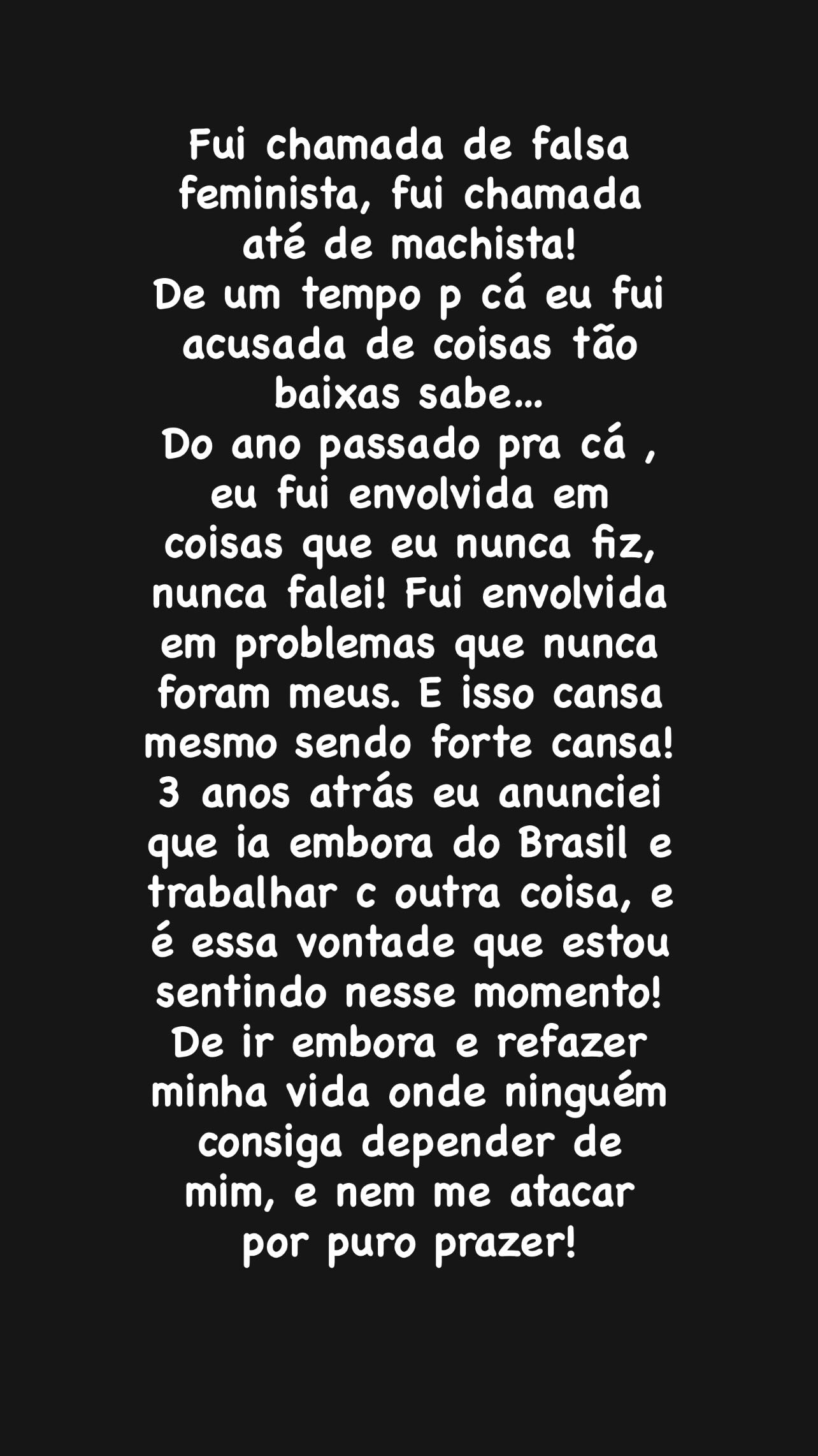 Carol revelou que, diante da pressão e dos julgamentos, tem pensado em deixar o Brasil: “Fui chamada de falsa feminista, de machista, envolvida em coisas que nunca fiz. Isso cansa. Já quis ir embora do país e trabalhar com outra coisa. E é essa vontade que estou sentindo agora: de recomeçar onde ninguém dependa de mim ou me ataque por prazer”, declarou.